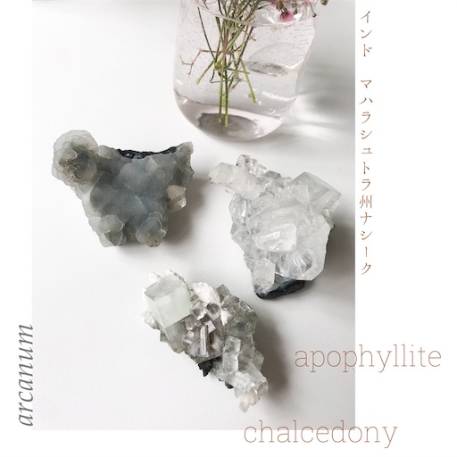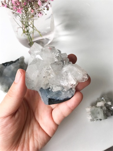 ハイバイブレーションなアポフィライトの光をブルーカルセドニーがまろやかにして、まるで光のミストのように空間に拡散させてくれるようなイメージのクラスターです。